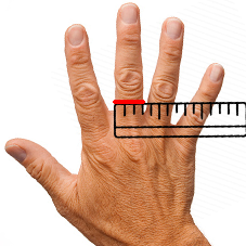 - Vezměte si pravítko nebo metr a změřte šířku vašeho prstu viz obrázek, měřte prst v místě, kde bude prsten.
